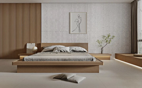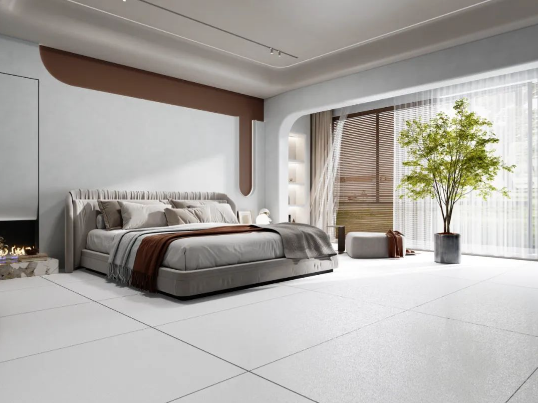 陽光透入,地面采用750x1500mm沁園春通鋪,啞、柔、亮的三維浮雕質(zhì)感效果,10°微光配合大面積木質(zhì)元素的運用,讓家居的自然氣息悄然流露,營造出舒適、溫馨的睡眠環(huán)境。