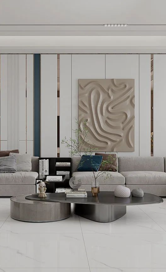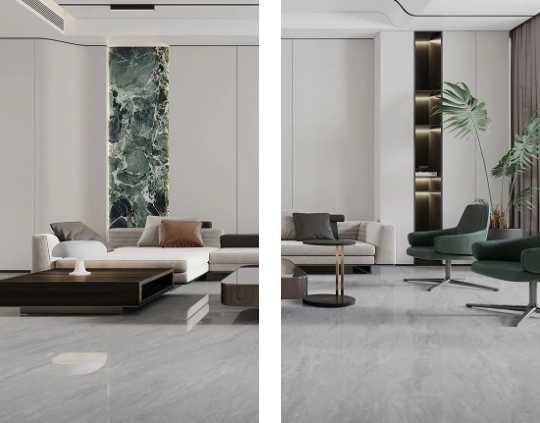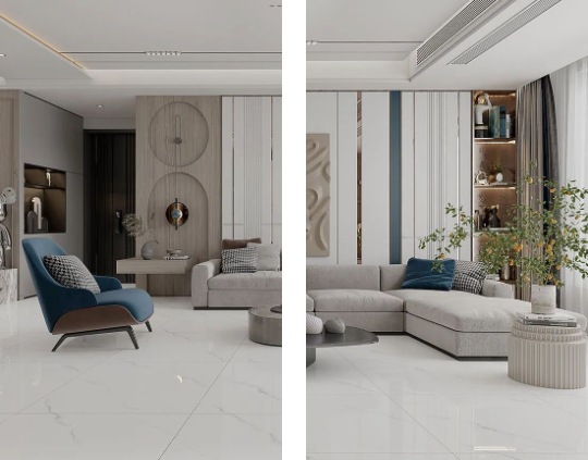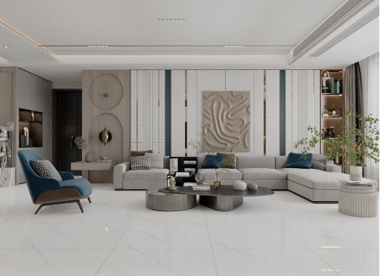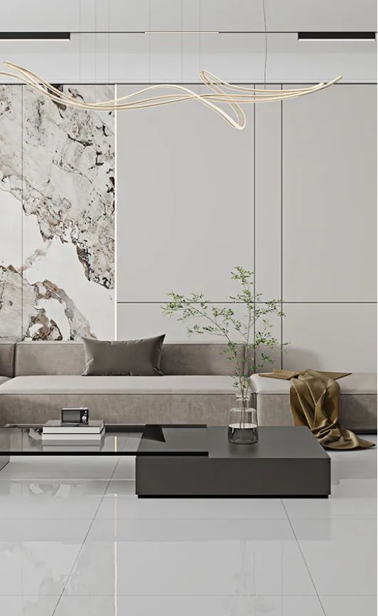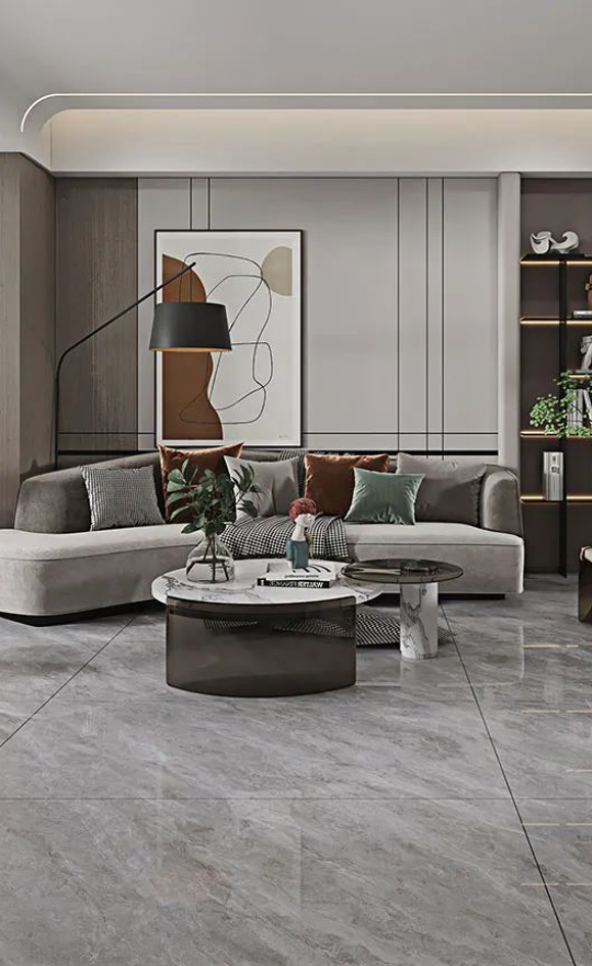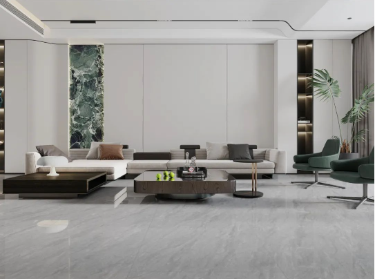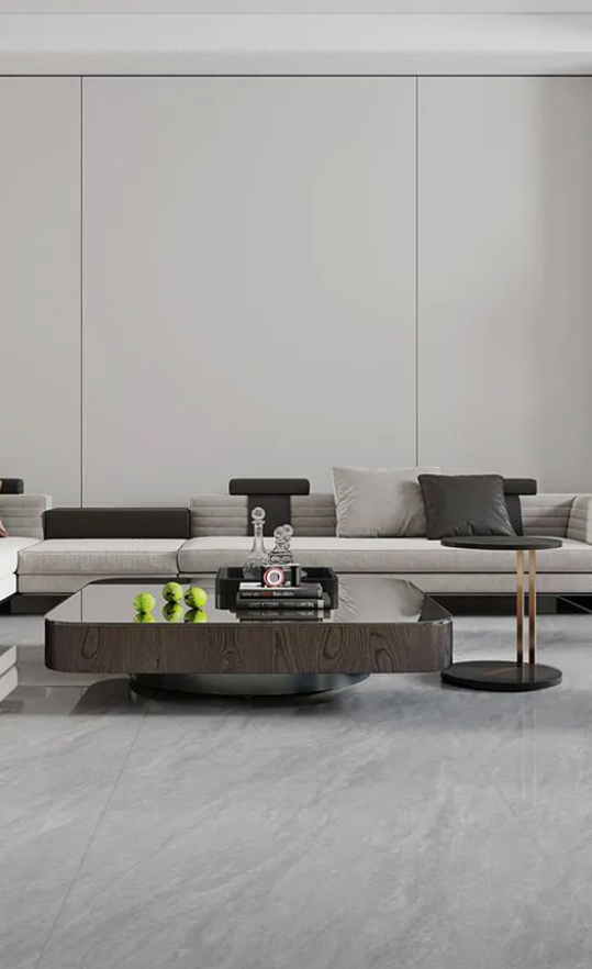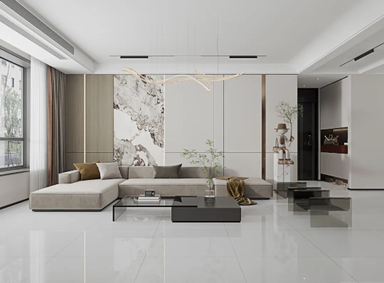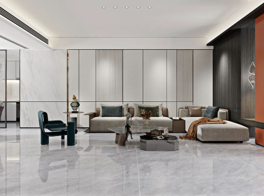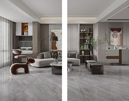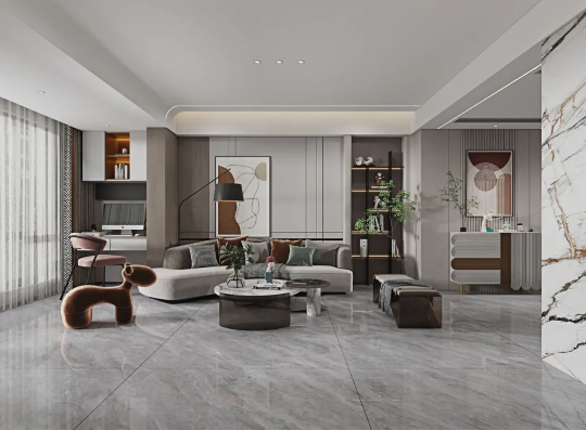 客廳作為家庭中最大的公共區域,是居住者和外客活躍的地方,地面鋪貼必須要防滑防污易打理,同時也要美觀大氣,在整體氛圍營造上,也需要體現家的溫馨。